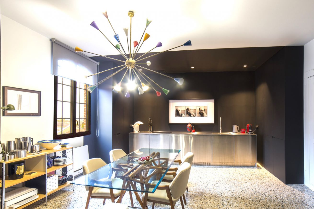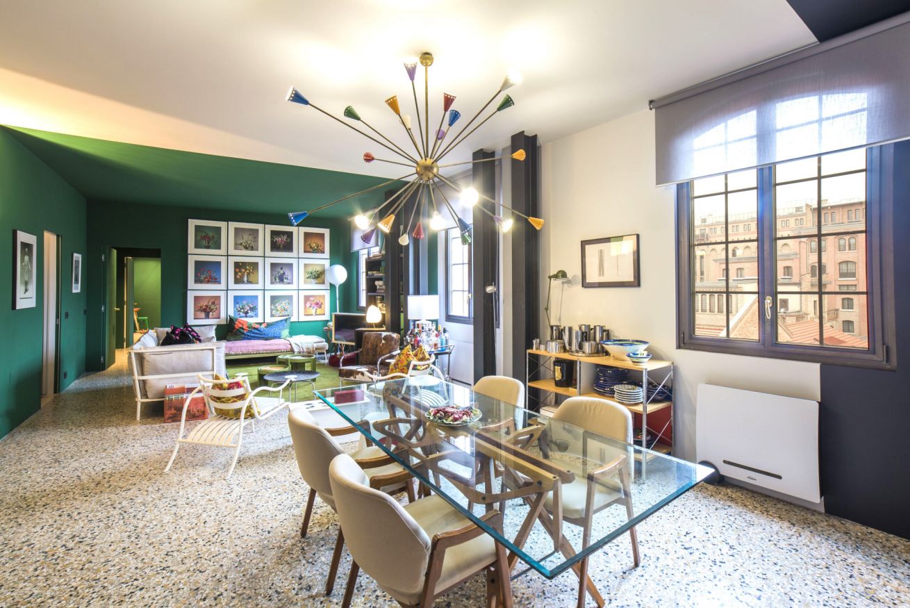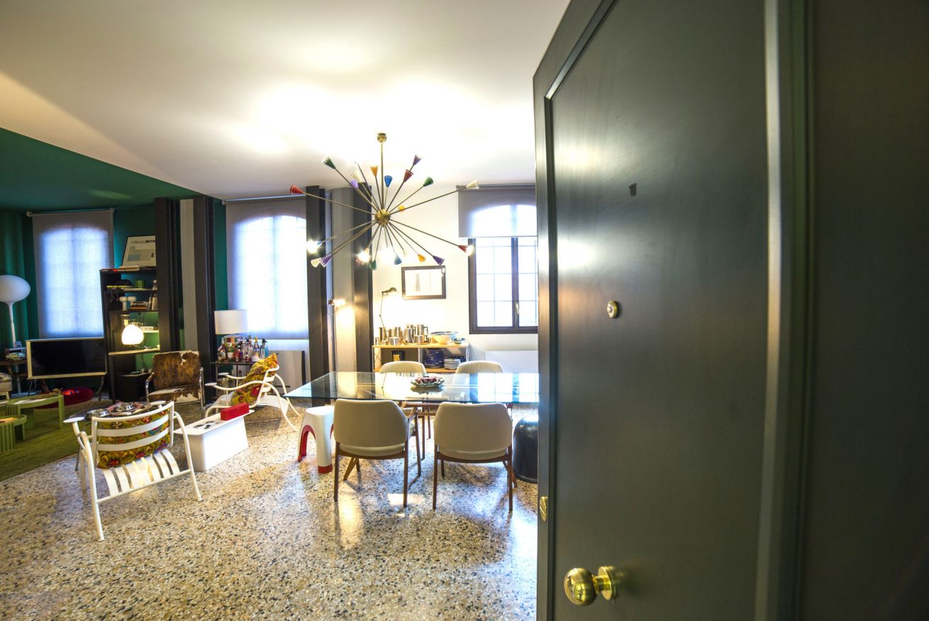 Situato nell'imponente complesso dell'ex molino Stucky, Ca' dei Colori è uno straordinario appartamento in cui tutto è colore e design, dal banco cucina minimalista in acciaio inox realizzato su misura, al bellissimo tavolo in rovere e vetro disegnato da Carlo Mollino, sovrastato dal lampadario Sputnik anni '50, alle 12 pagine incorniciate del rarissimo calendario che Steven Meisel ha realizzato per Loewe, attraverso una serie di oggetti e mobili che lo rendono unico ed irrinunciabile.